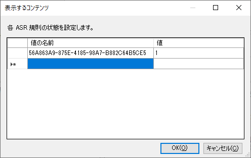 - [ コンピューターの構成 ]>[ ポリシー ]>[ 管理用テンプレート ]>[ Windows コンポーネント ]>[ Microsoft Defender ウイルス対策 ]>[ Microsoft Defender Exploit Guard ]>[ Attack Surface Reduction ]>[ Attack Surface Reduction 規則の構成 ]:[ 有効 ]