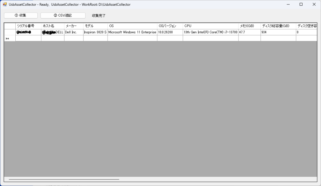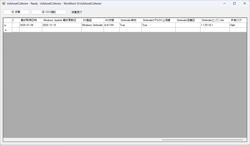 [ ② CSV 追記 ] をクリックすると、USB メモリのルートフォルダーに [ UsbAssetCollector ] というフォルダーを自動作成し、そのフォルダーに [ IT_Asset_Register_Collected.csv ] を生成し、PC の資産情報を追記します。